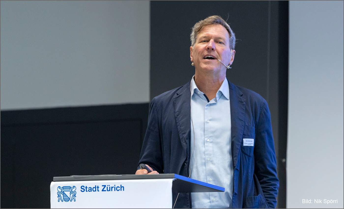 Eva Brugger brachte in ihren Begrüssungsworten den sprichwörtlichen Elefanten im Raum zur Sprache: die indirekten CO₂-Emissionen. René Estermann, Direktor von Umwelt- und Gesundheitsschutz Stadt Zürich UGZ, knüpfte in seiner Grussbotschaft daran an: Zwar seien die Stadt und die gemeinnützigen Bauträger dabei, bei den direkten Emissionen, also beim Betrieb von Gebäuden, grosse Schritte Richtung Netto-null zu unternehmen. Dennoch seien es immer noch etwa zwei Tonnen CO2 pro Kopf, die wir jährlich verursachen. Der Bereich Bau verursacht zudem an indirekten Emissionen nochmals zwei Tonnen pro Kopf .