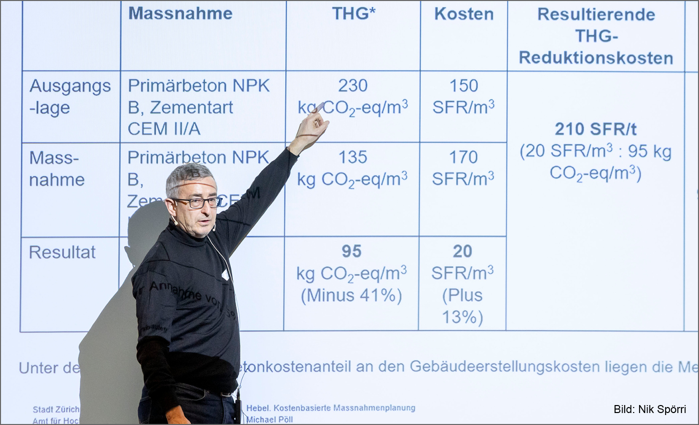 Das Amt für Hochbauten verbaut laut Michael Pöll rund 550 Millionen Franken pro Jahr und ist damit einer der grössten Bauträger der Schweiz. Für ihn sind Hebel – einerseits Kosten bzw. Einsparungen und andererseits Emissionsreduktionen – entsprechend wichtig. Zwar zeigt sein «Aktionsplan für Bauvorhaben» noch einige Unbekannte. Daraus geht aber auch klar hervor, dass schon durch die Reduktion der Untergeschosse (bis zu 15 %), durch Hybridbau mit Holz (bis zu 12 %) und der Verwendung von Recycling-Beton abermals viel eingespart werden kann, oft sogar Kosten. (Siehe auch Fachstudien Einsparung THG-Emissionen> und Kostenauswertung>)